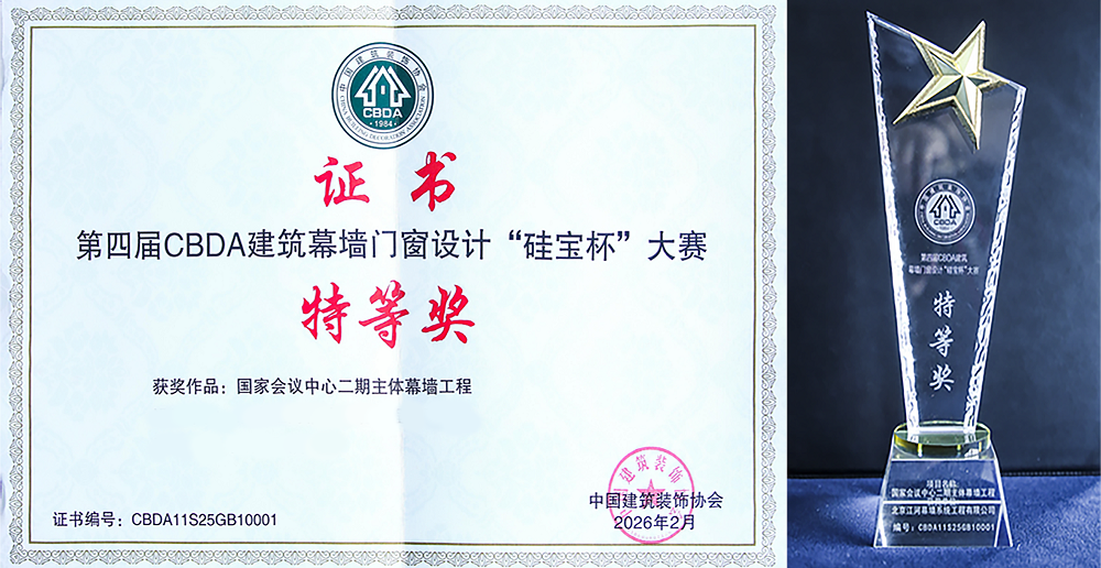 國家會(huì)議中心二期主體幕墻工程榮獲第四屆CBDA建筑幕墻門窗“硅寶杯”設(shè)計(jì)大賽特等獎(jiǎng)