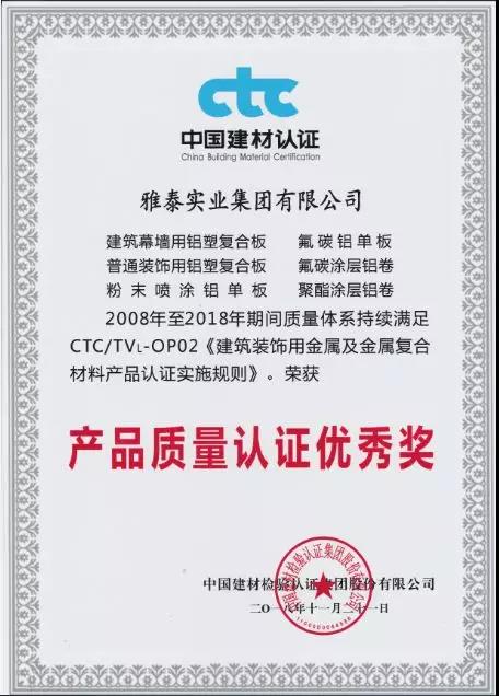 會上,雅泰產(chǎn)品憑借2008年至今2018年期間質(zhì)量體系持續(xù)滿足CTC/TVL-OP02《建筑裝飾用金屬及金屬復(fù)合材料產(chǎn)品認(rèn)證實(shí)施規(guī)則》,榮獲2018年度CTC產(chǎn)品質(zhì)量認(rèn)證優(yōu)秀獎(jiǎng)。YARET牌鋁塑復(fù)合板,2015年至2018年期間經(jīng)中國建材檢驗(yàn)認(rèn)證集團(tuán)股份有限公司抽樣全項(xiàng)檢測,產(chǎn)品質(zhì)量符合中華人民共和國國家標(biāo)準(zhǔn)(GB/T 17748-2016/2008、GB/T22412-2016),被授予2018年度產(chǎn)品合格證。