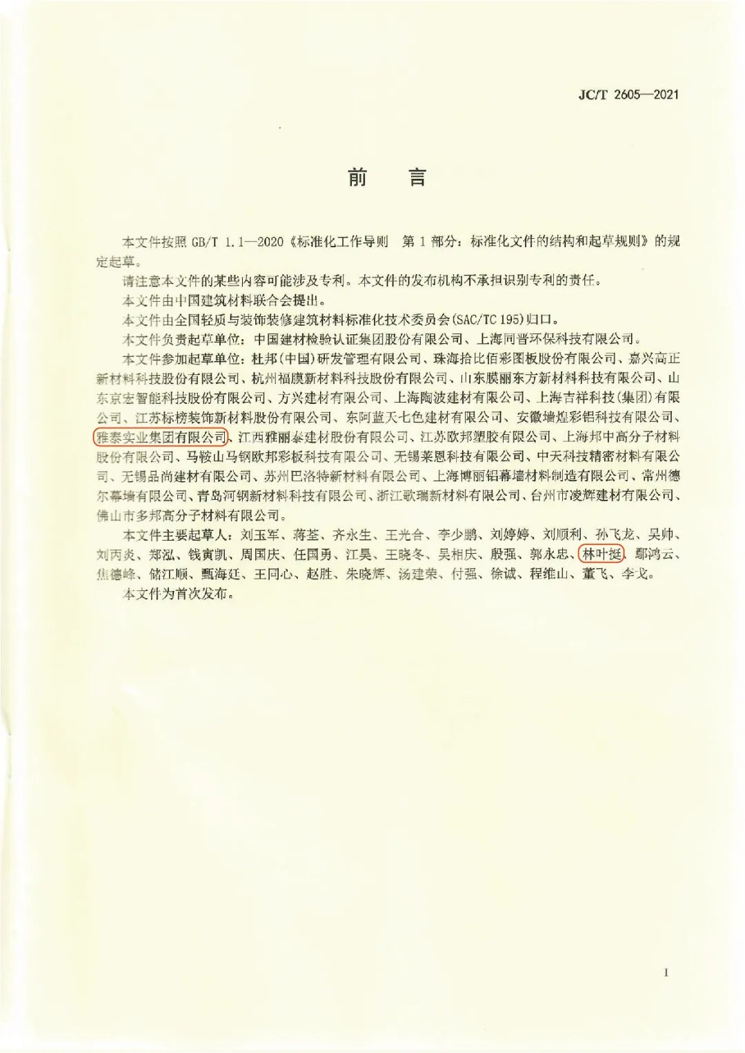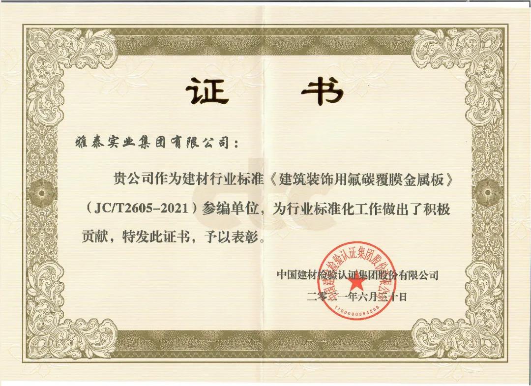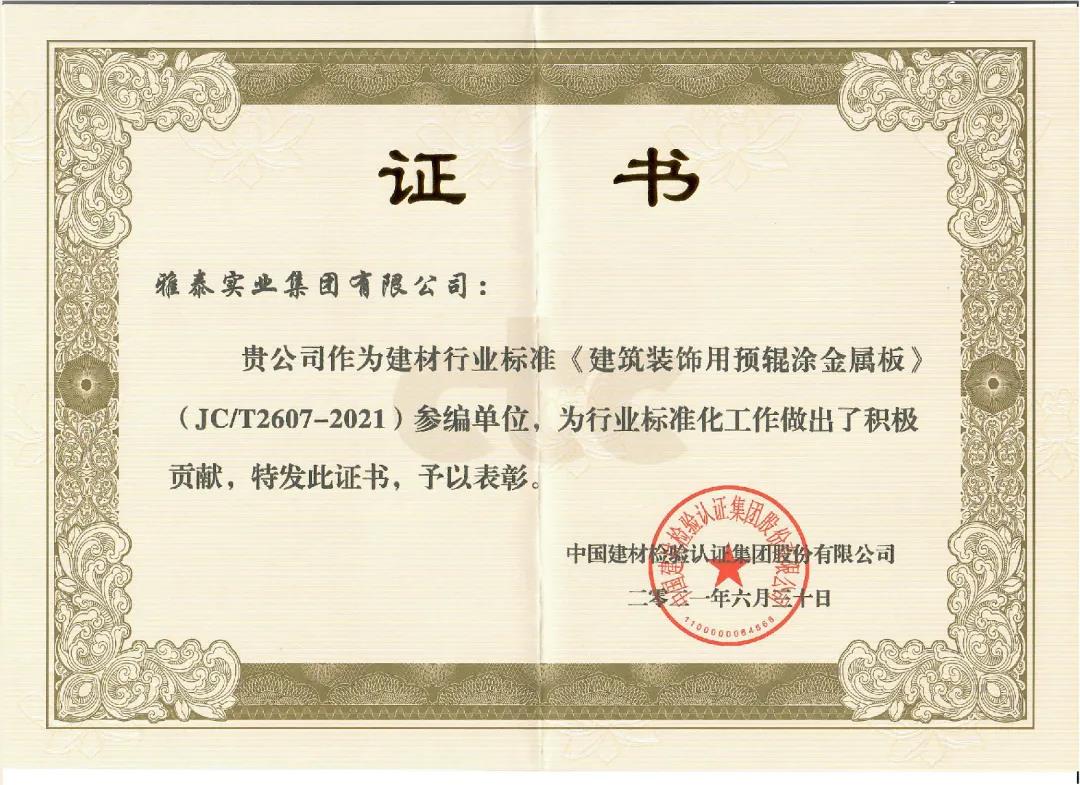 近日,由中國建筑材料聯(lián)合會提出,雅泰實業(yè)集團參與起草的《JC/T2605-2021建筑裝飾用氟碳覆膜金屬板》、《JC/T2607-2021建筑屋面用預輥涂金屬板》兩項行業(yè)標準于2021年3月5日發(fā)布,同年7月1日正式實施,公司技術部經理林葉挺為此次兩項行業(yè)標準的主要起草人之一。
