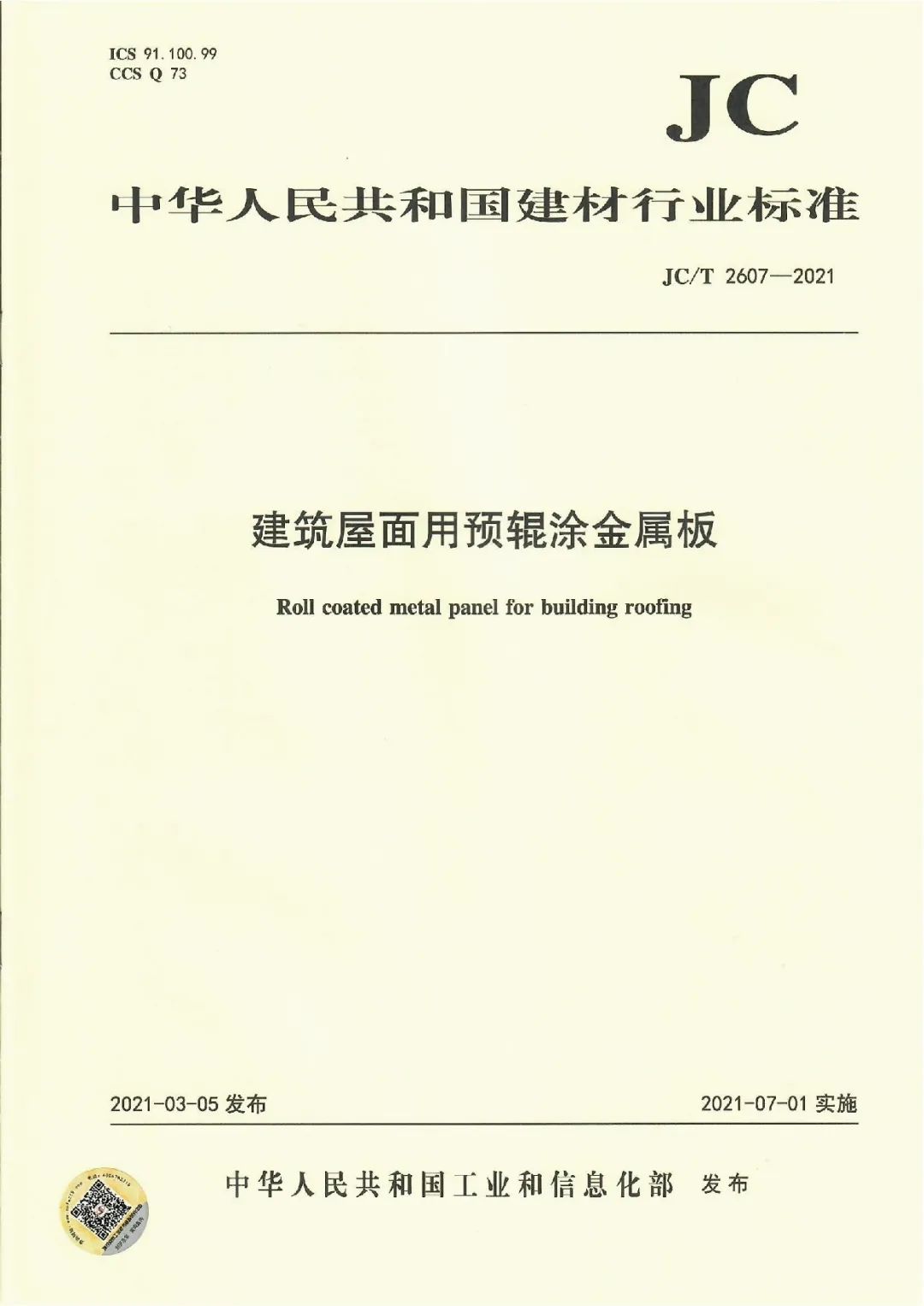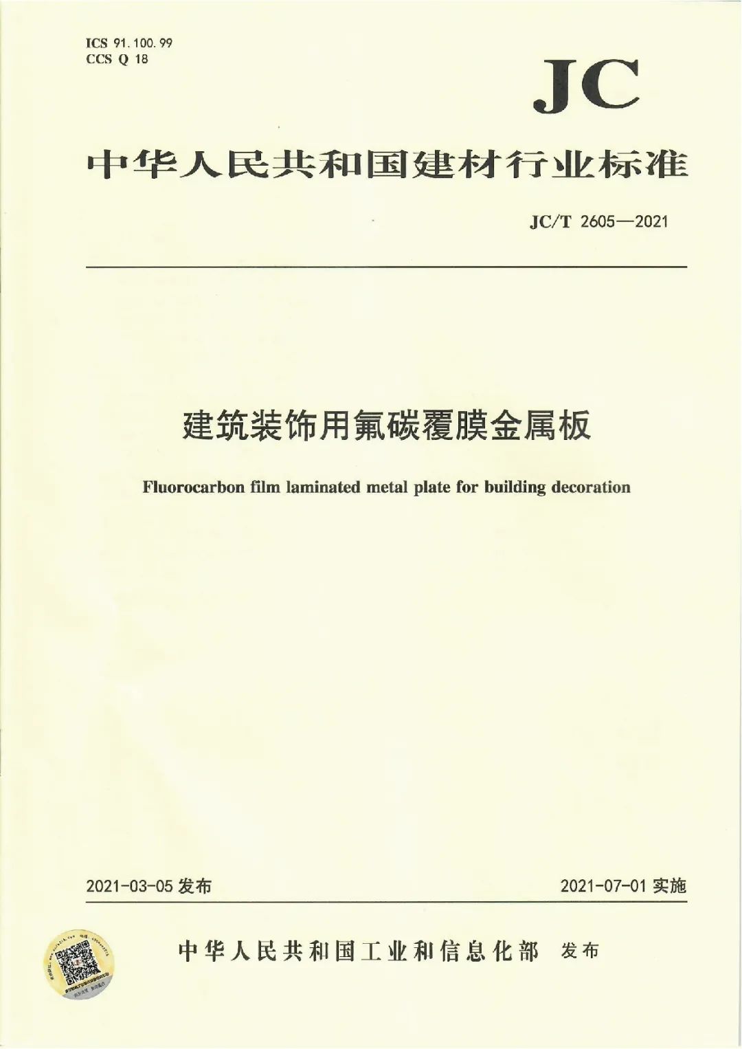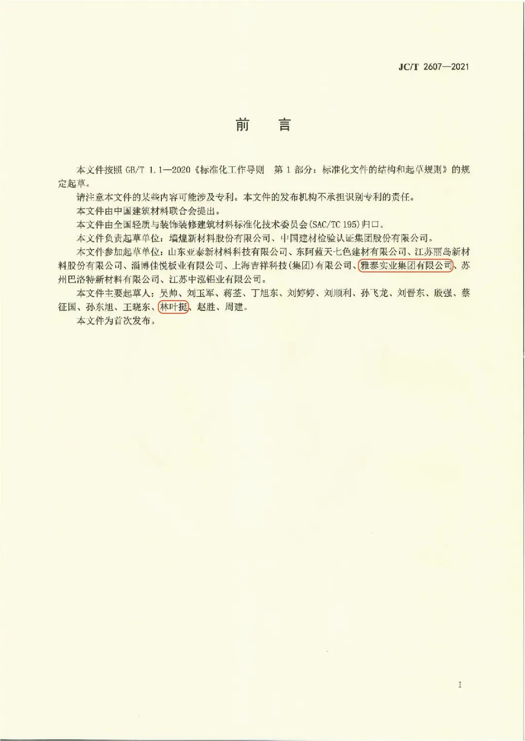 近日,由中國建筑材料聯(lián)合會提出,雅泰實業(yè)集團參與起草的《JC/T2605-2021建筑裝飾用氟碳覆膜金屬板》、《JC/T2607-2021建筑屋面用預輥涂金屬板》兩項行業(yè)標準于2021年3月5日發(fā)布,同年7月1日正式實施,公司技術部經理林葉挺為此次兩項行業(yè)標準的主要起草人之一。