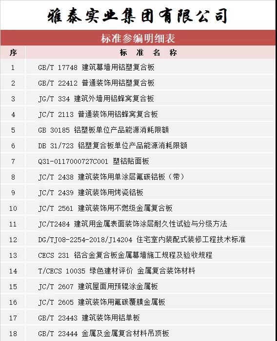 截至目前,雅泰作為參編單位參與國家標準、行業(yè)標準等各項標準共計 18 項(詳見參編標準一覽表),逐漸成為行業(yè)推進標準化工作的主力軍之一,不斷證明公司地位及整體生產水品、產品實力等已得到業(yè)內認可。