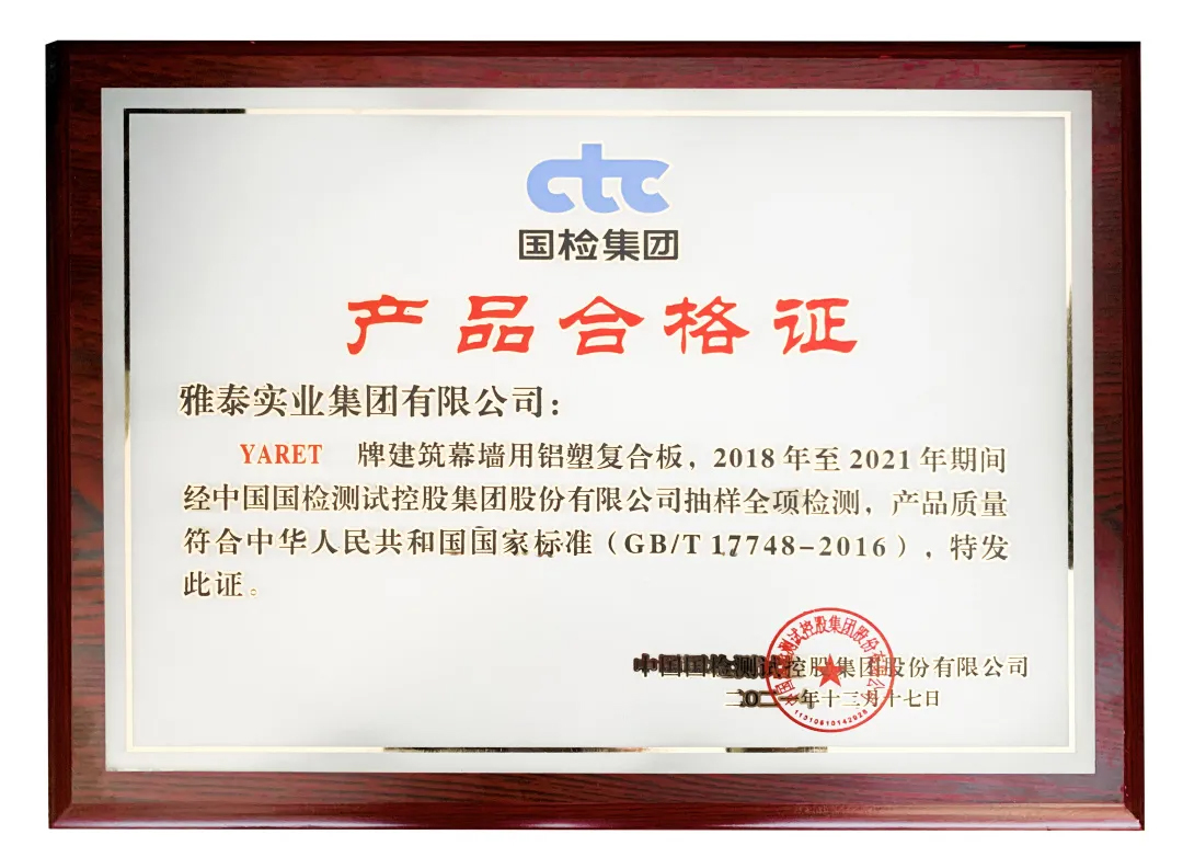 會(huì)上,對(duì)2021年度行業(yè)優(yōu)秀的產(chǎn)品與企業(yè)進(jìn)行了表彰頒獎(jiǎng)——雅泰 YARET 牌鋁塑復(fù)合板,于2018年至2021年期間經(jīng)中國建材檢驗(yàn)認(rèn)證集團(tuán)股份有限公司抽樣全項(xiàng)檢測,產(chǎn)品質(zhì)量符合中華人民共和國國家標(biāo)準(zhǔn)(GB/T 17748-2016),榮獲2021年度CTC認(rèn)證產(chǎn)品合格證。